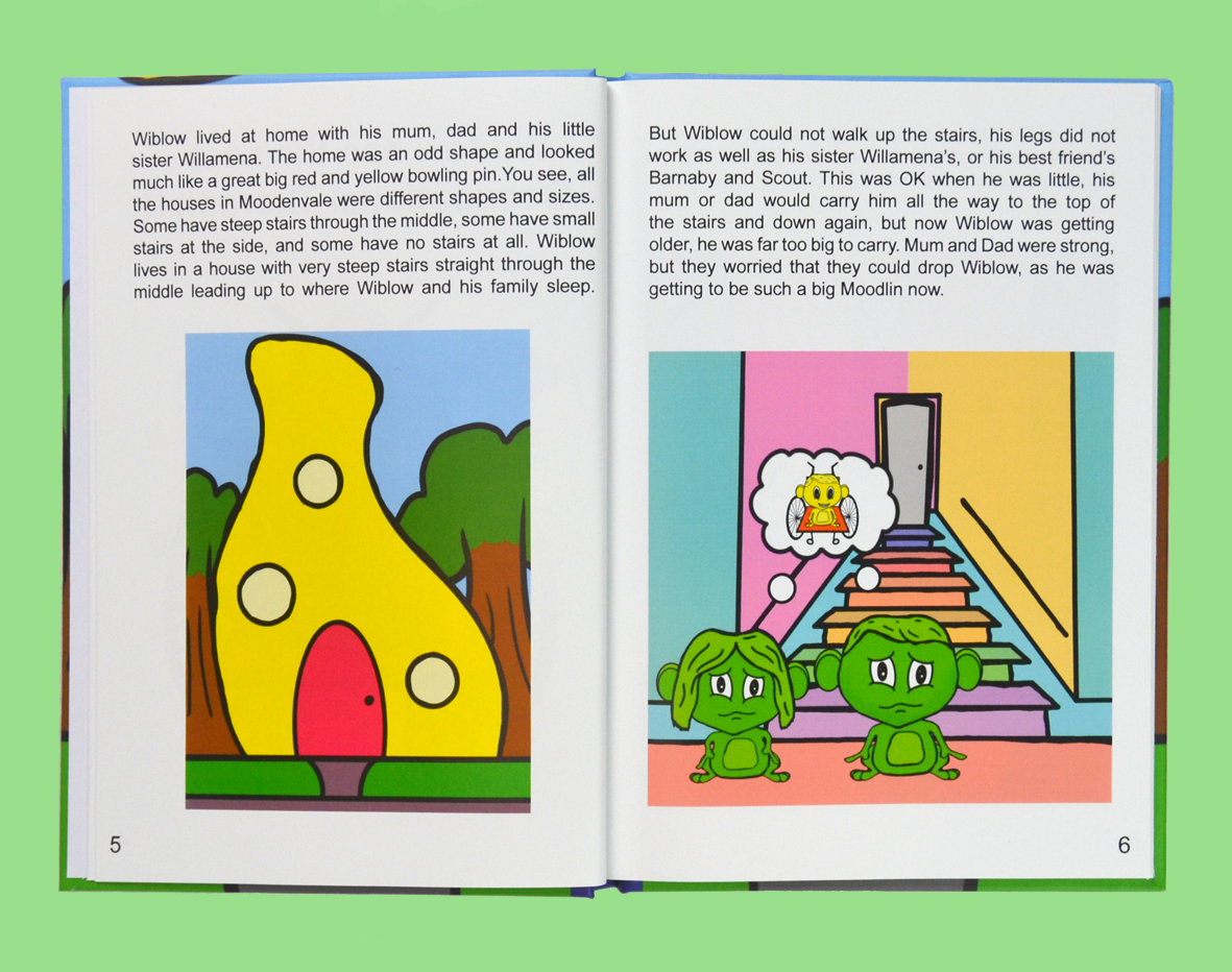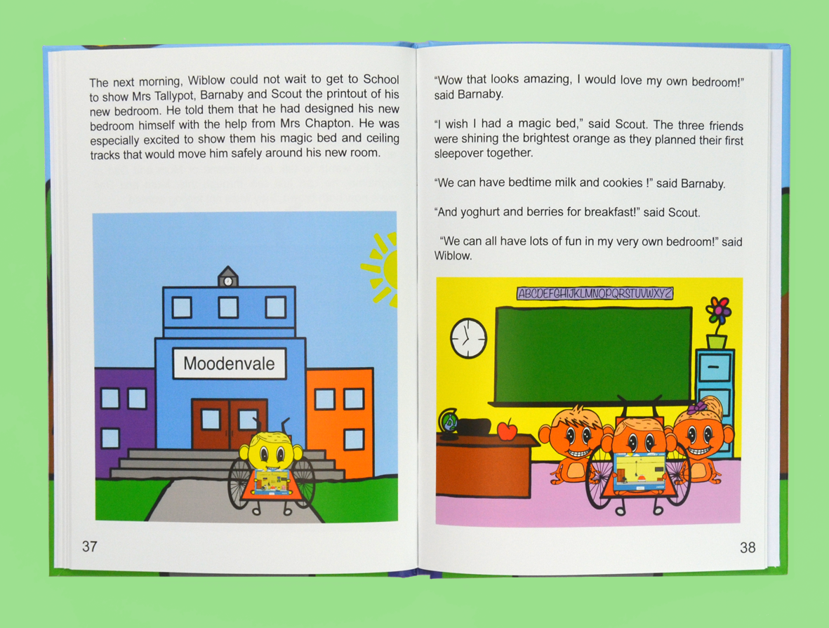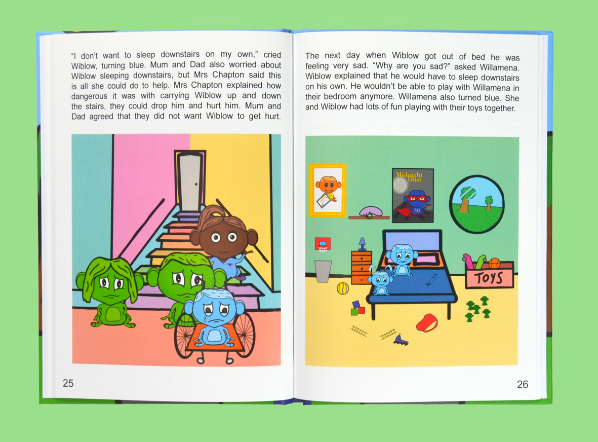 When Wiblow gets too big to be carried upstairs, his parents start to worry about how he will get up to bed every night. His Mum contacts Sarah Chapton an Occupational Therapist, who, using the app My House, helps Wiblow design his very own new bedroom. At first Wiblow does not want a new bedroom downstairs away from his little sister, but after Mrs Chapton helps him to create his bedroom, he starts to look forward to having his own room where his little sister and his friends Barnaby and Scout can come for sleepovers and fun!