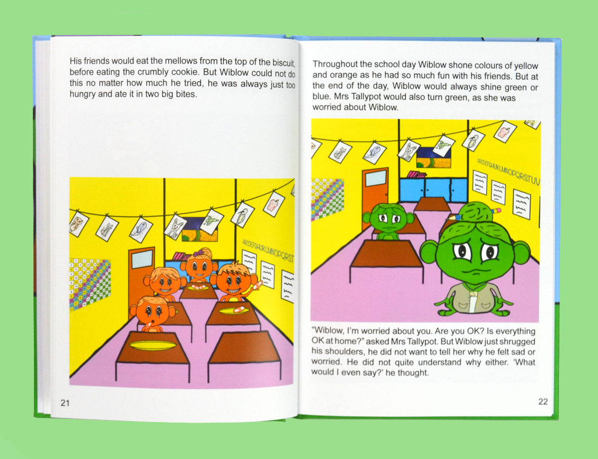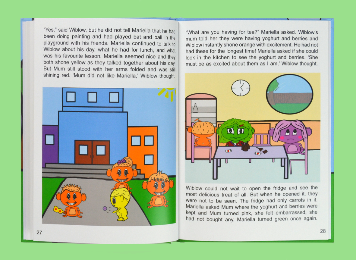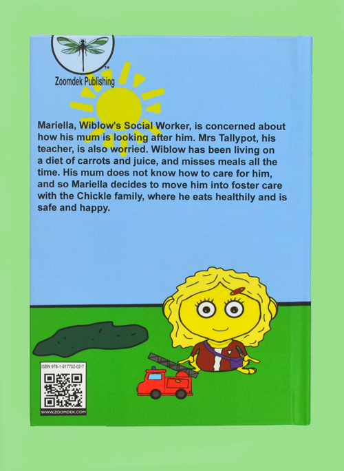 Mariella, Wiblow’s Social Worker, is concerned about how his mum is looking after him. Mrs Tallypot, his teacher, is also worried. Wiblow has been living on a diet of carrots and juice, and misses meals all the time. His mum does not know how to care for him correctly and so Mariella decides to move Wiblow into foster care with the Chickle family, where he eats healthily and is safe and happy.
